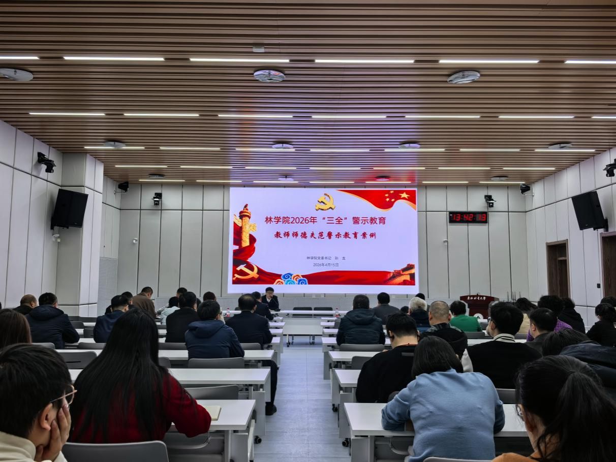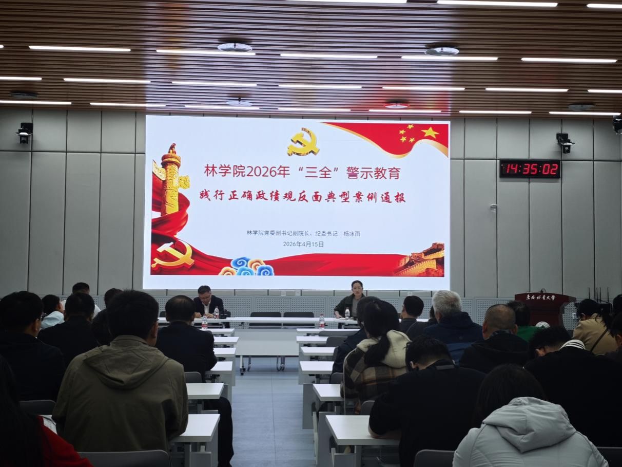为持续营造严的氛围、树立正的风气,建立健全常态化长效化警示教育机制,将警示教育融入日常、抓在经常,一体推进不敢腐、不能腐、不想腐,引导全院教职工特别是党员干部筑牢信仰之基、补足精神之钙、把稳思想之舵,切实将遵规守纪内化于心、外化于行。2026年4月15日13:40,林学院在林科楼116会议室组织召开2026年度“三全”警示教育大会。学院领导班子成员及全体教职工参加会议。会议由东北林业大学党委常委、校长助理、学院党委书记孙龙,党委副书记、副院长兼纪委书记杨冰雨分别作专题警示教育通报。