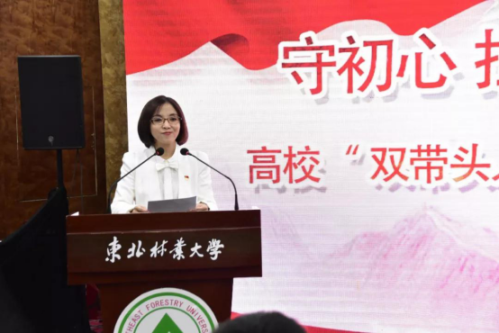 东北林业大学党委副书记陈文慧首先代表学校党委致辞,她向前来参加会议的省教育工委的领导和兄弟高校教师“双带头人”党支部书记们表示热烈的欢迎和衷心的感谢。她表示,在全国高校深入开展“不忘初心,牢记使命”主题教育之际,这次会议的举办,正是贯彻主题教育学做结合,干事创业担当作为的具体举措。她强调,近年来,东北林业大学党委深入贯彻党的十九大精神和全国教育大会精神,落实教育部党组的各项部署和要求,切实加强基层党组织建设。黑龙江为新中国的建设做出过巨大的贡献,但其发展中存在的问题不容忽视,对于解决这些问题,东北林业大学有着义不容辞的责任。在省委书记张庆伟“龙江重振雄风再出发”的号召下,东北林业大学林学院党委发起倡议,与近五十所高校党支共建,将成立“高校专家助力龙江发展联盟”,期待各兄弟高校的科研成果能够在龙江大地上开花结果,为龙江学子成长成才领航,合力助推龙江发展。