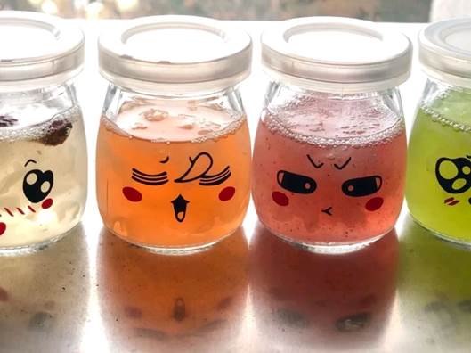 这是一款以蓝蝴蝶和洛神花茶为主的时尚饮品,其中加入枸杞、樱桃、蓝莓等营养物质。味道清新甘甜,清丽滋润。还有以茶汁做成的清新高颜值的茶冻,其中的花青素可以提高和保护视力。此两款产品是炎炎夏日高颜值高营养的必备伴侣。