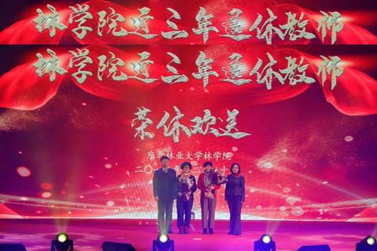 活动的高潮是学院精心设计的环节,为退休教师举办荣休仪式, 学院借助表彰大会的平台,感谢这些年为林学院发展付出辛勤努力、无私奉献却又无怨无悔的退休老教师们。退休教师代表薛煜老师和高玉梅老师精心录制了视频,在大会现场由孙龙院长和宋妍书记为他们送上鲜花和纪念品。学院不会忘记每位教师曾经做出的卓越贡献,林学以后每年都会举行这样的荣休仪式。