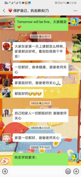 在抗击新冠肺炎疫情的斗争中,除了学生的安全健康状况,学生线上学习情况也成为了许多老师担忧的问题。为真正做到“停课不停学”,2018级本科生辅导员林岩老师和黄瑜老师依托各类新媒体媒介,迅速进行了无死角、全覆盖的线上教育,对全体学生进行了“一对一”、“点对点”的全面排查,确保无遗漏。