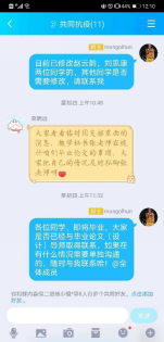 研究生专职辅导员蒋春阳老师通过年级群、班长群、班级群、党支部群、学科群、导师群,线上党支部大会、班会等媒介,发布各类预防疫病的信息和学校有关管理规定信息。同时关注经济困难学生的需求,学生的心理动态,并及时给予关心和帮助,帮助毕业生做好毕业协调事宜。