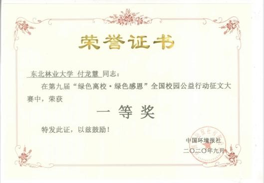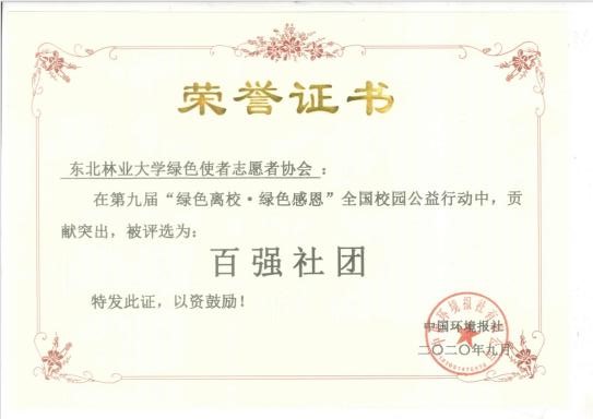 为切实贯彻习近平生态文明思想和党的十九大、十九届三中、四中全会生态建设决策,推进落实学校第十三次党代会精神,宣传生态文明理念,9月15日,东北林业大学绿色使者志愿者协会参加了由中国环境报社、中国环保网、物物福公益联合发起主办的第九届“绿色离校·绿色感恩”全国校园公益行动评选活动并获得黑龙江省唯一一个“百强社团”的荣誉称号。