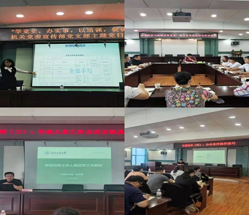 本期培训班特邀林学院党委书记宋妍、校党委宣传部副部长孟姝轶、校党委学工部部长、武装部部长、学生处处长王博、校办公室副主任苏志刚、信息学院辅导员侯岚亭,以专题辅导、现场教学、沙龙讲座、实操演练等方式,共进行五次课程讲授。主要针对学院机关工作人员进行提升机关工作质量、公文写作能力提升、转变对机关事务性工作的思考模式、处理应急突发事件能力提升、办公软件实操能力提升等方面的讲解,同时就新入职人员开展提高思想认知、日常工作解析、强化工作技能等多方面业务能力强化培训。