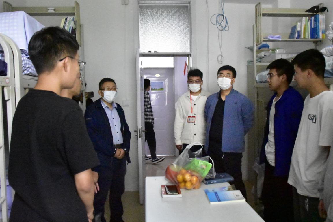 张鹏院长、董利虎院长、辅导员曹灿老师来到4号学生公寓。将精心准备好的水果和月饼递到每位寝室长的手里,并与各寝室的同学进行了亲切的交流。