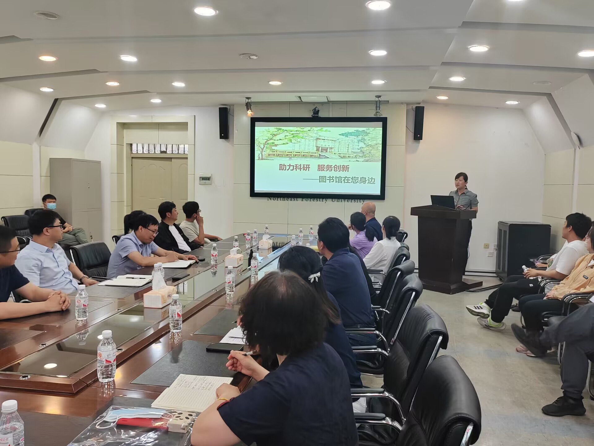 张凤斌馆长向与会代表介绍了来自图书馆各个职能部门的精兵强将,表达了为林学院送服务的热情,希望通过此次座谈了解到林学院的师生最真实的需求,积极探索图书馆服务学院教学科研的新模式,以便今后能为学院提供精准化、定制化服务。会议首先由图书馆检索教研室主任李海英做了题为《助力科研,服务创新—图书馆就在你身边》的报告,分别从资源、服务、空间三个方面介绍了图书馆的功能和所能提供的各项服务,深化了林学院师生对图书馆各项服务内容更为全面的了解。接下来林学院教授、青年人才、实验教师、学生代表分别从图书馆的系统、高质量文献服务、专利服务、宣发等方面,提出了具体建议。图书馆各部门负责人对教师代表提出的宝贵建议和需求,给予了充分的肯定,对应各项问题也做了详尽的解答,互留了联系方式,以便及时获取学院的教学和研究需求,进一步优化服务质量,第一时间为师生提供精准服务。