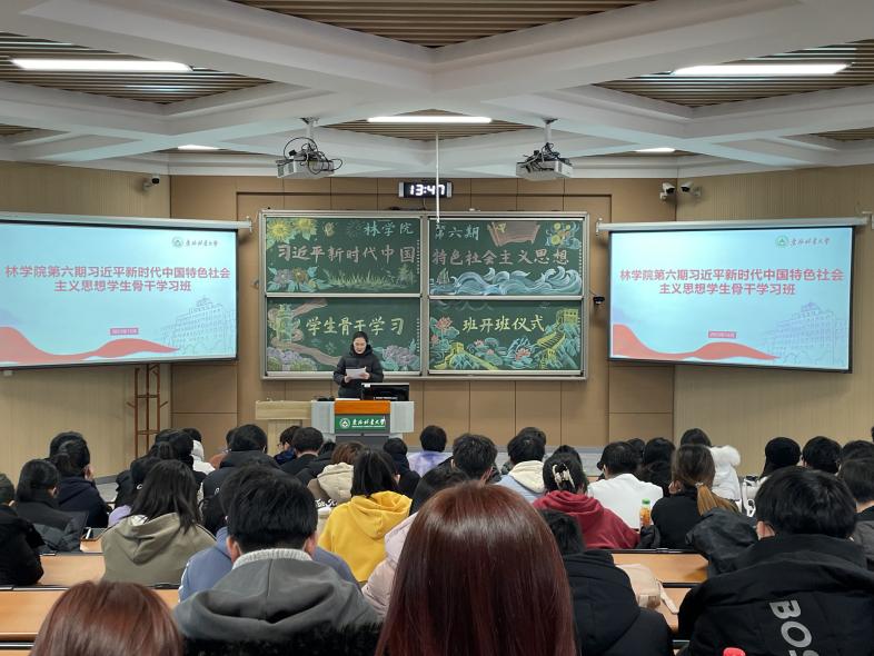为积极响应党中央号召,践行党的二十大精神,引导学生学习习近平新时代中国特色社会主义思想,弘扬塞罕坝精神,林学院于2023年12月9日在锦绣楼T201教室举办林学院第六期“习近平新时代中国特色社会主义思想”学生骨干学习班开班仪式。林学院党委副书记、副院长杨冰雨出席本次活动,马克思主义学院教师刘甜甜作首场专题辅导报告,开班仪式由学习班班主任、团委书记王珏主持。