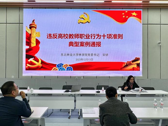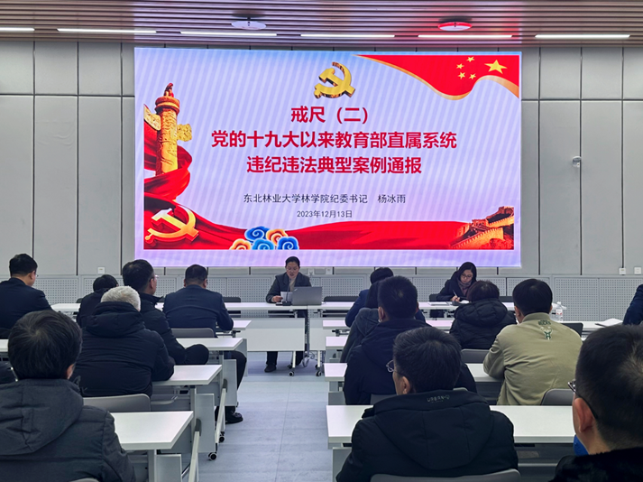 为深入贯彻落实《中共中央办公厅关于加强新时代廉洁文化建设的意见》《东北林业大学关于加强新时代廉洁文化建设的责任分工方案》精神和教育部巡视整改要求,进一步引导党员干部、广大教师知敬畏、明底线、受警醒,全面营造“严的氛围”,根据学校相关文件要求,2023年12月13日下午,林学院在林科楼116会议室召开“警示教育案例通报学习大会”,学院领导班子和全体教职工参与本次会议。