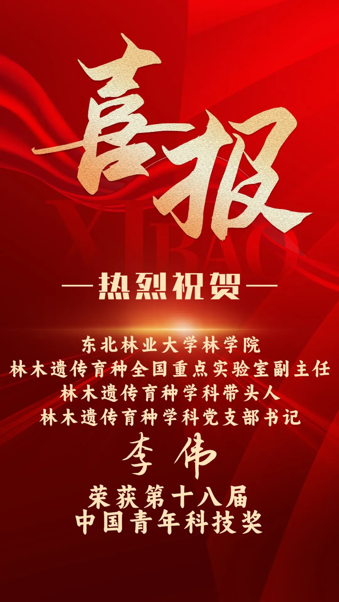 日前,由中共中央组织部、人力资源和社会保障部、中国科协、共青团中央共同主办的第十八届中国青年科技奖颁奖仪式在浙江温州举行。我院林木遗传育种学科带头人李伟教授荣获第十八届中国青年科技奖。