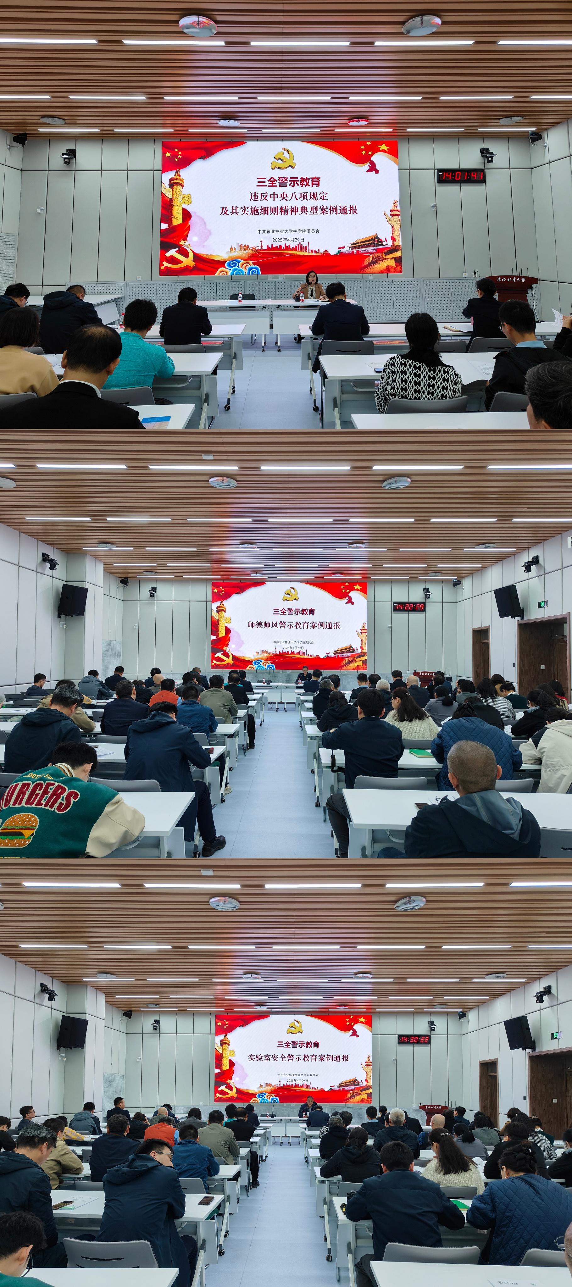 为深入学习贯彻习近平总书记关于开展党的建设重要思想和在二十届中央纪委四次全会上的重要讲话精神,深入贯彻中央八项规定精神学习教育,认真落实关于2025年全面从严治党会议要求,强化纪律规矩意识,筑牢安全廉洁防线,2025年4月29日,林学院在林科楼116会议室召开全体教职工大会,林学院领导班子和全体教职工参与本次会议,林学院党委书记宋妍,副院长姜洋,党委副书记副院长、纪委书记杨冰雨面向学院全体教职工进行“三全”警示教育违纪行为典型案例通报。