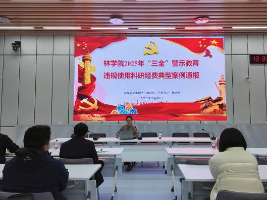 为深入贯彻坚定不移全面从严治党战略方针,锲而不舍落实中央八项规定精神,深刻把握坚持作风建设永远在路上的内在要求,以教育家精神为引领,持续深化师德师风建设,充分发挥典型案例震慑、警示、教育作用,引导全院党员干部知敬畏、存戒惧、守底线,持续巩固风清气正的政治生态和育人环境。2025年10月29日12时,林学院在林科楼116会议室召开全体教职工大会,林学院领导班子及全体教职工参会,林学院党委书记孙龙、副书记副院长、纪委书记杨冰雨面向学院全体教职工进行“三全”警示教育案例通报。