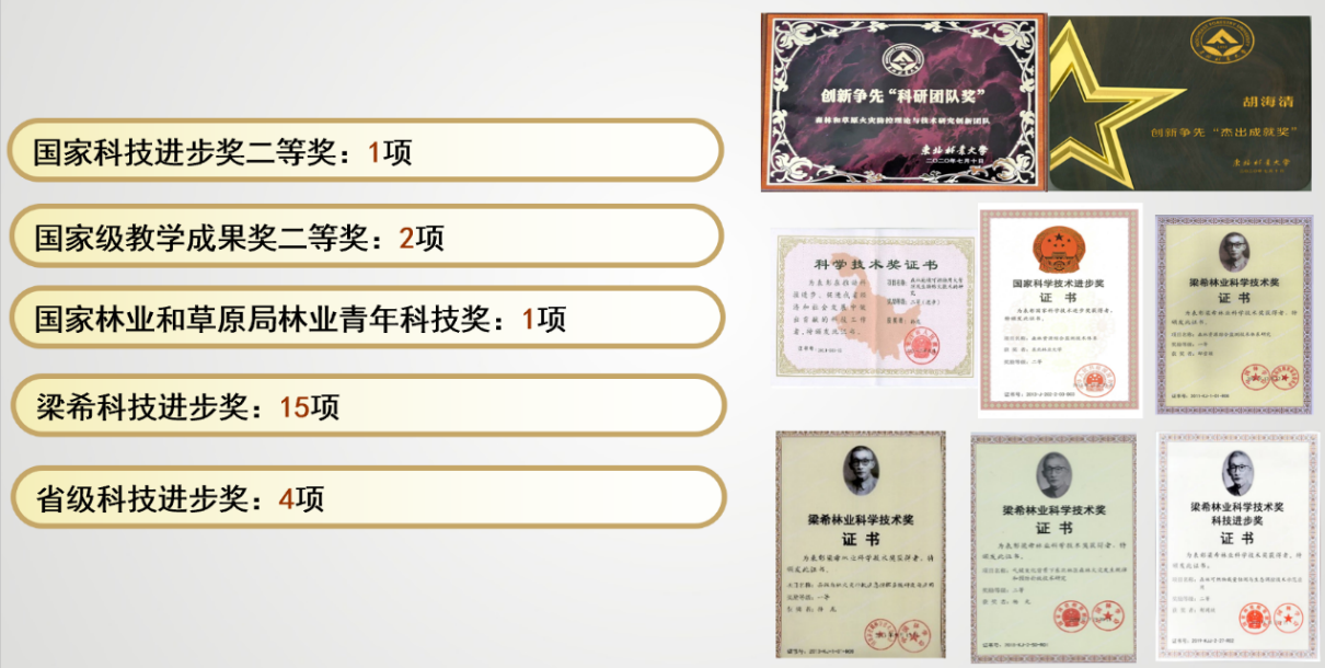 针对我国森林草原火灾防控领域发展的重大需求,建设集林火生态研究、火灾防控基础理论研究、林火监测预警技术、可燃物管理技术、林火装备研发以及林火扑救技术为一体的国内一流研究团队。承担国家重点研发计划战略性国际合作项目、国家重点研发计划课题、林业公益性行业科研专项重大项目、国家自然科学基金等共40项,累计主持科研经费超过7700万元。获得国家科技进步奖1项,省部级奖励18项,发表论文320余篇,其中SCI论文90余篇,授权发明专利16项,制修订国家、行业和地方标准9项。