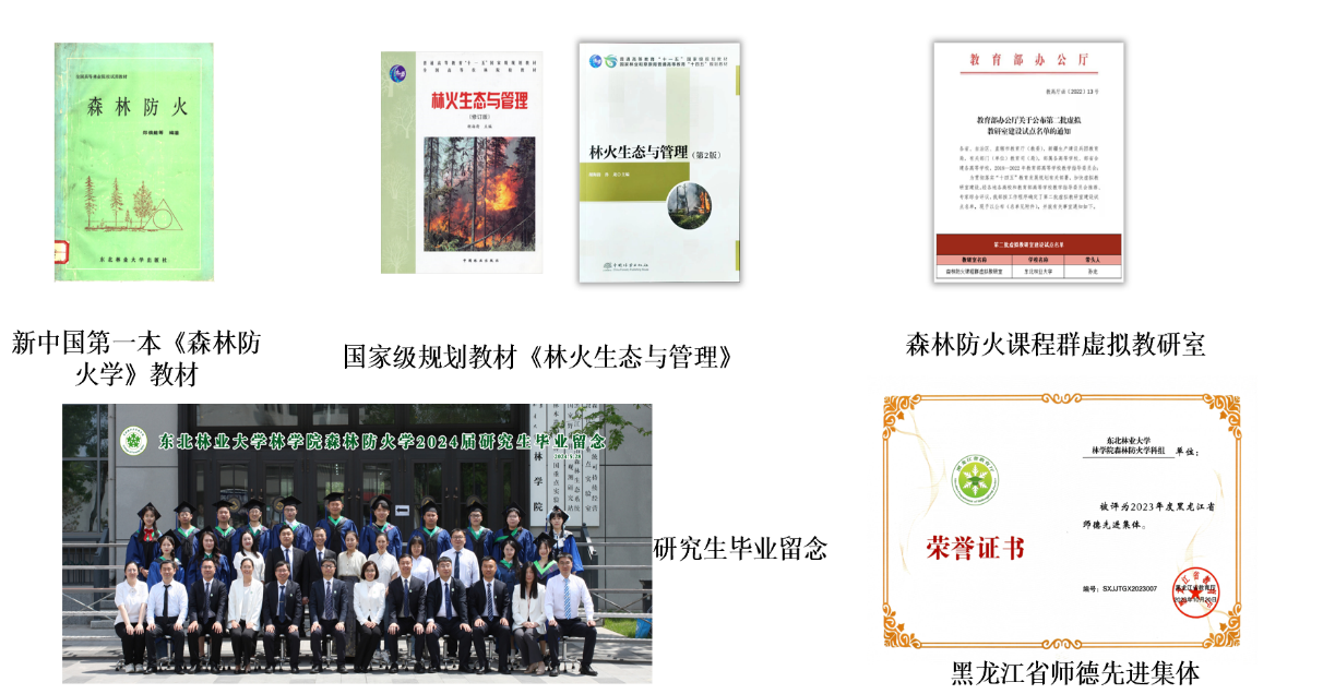 20世纪50年代初,我国森林防火领域创始人郑焕能教授率先在森林学中开辟了森林防火教学与研究方向;1982年,开始招收森林防火硕士研究生;1986年,开始招收森林防火专科学生;2008年,成为森林防火博士点学科;2009-2013年,招收森林防火专业本科生。目前是我国唯一能够培养和授予森林防火专业方向硕士和博士学位的高等教育单位。已培养森林防火专业本科生和研究生500余名,成为我国森林防火管理、教学和科研工作的领军人物和骨干力量。编写了新中国第一本《森林防火学》教材;国家级规划教材《林火生态与管理》是我国高等农林院校中应用范围最广的森林防火教材;联合北京林业大学、西北农林科技大学、福建农林大学等12所高校共建的“森林防火课程群虚拟教研室”入选教育部虚拟教研室建设名单。